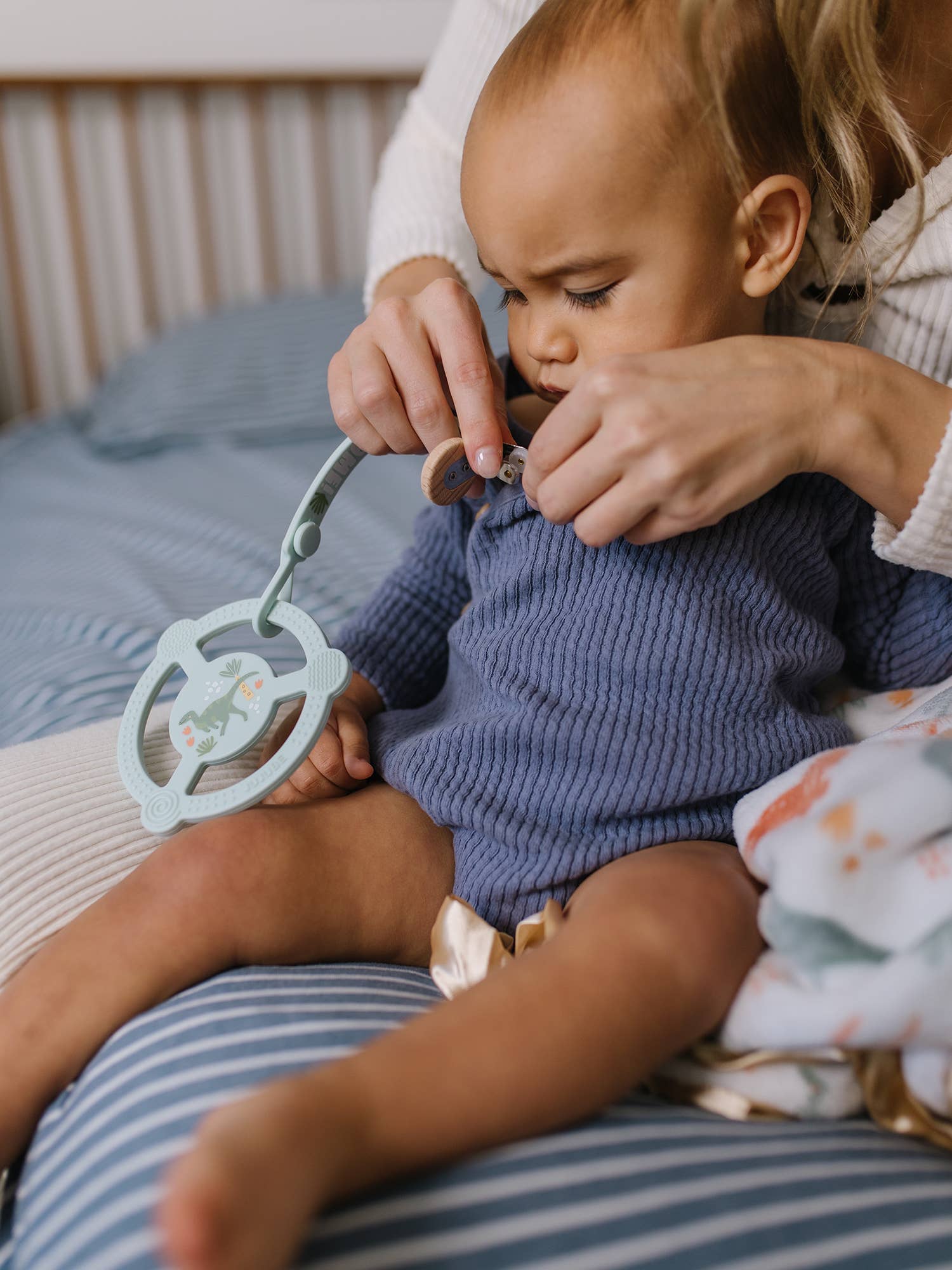 Help soothe your baby’s sore gums with the Silicone Teether Ring with Detachable Clip from JuJuBe x Studio Oh! This teether features an easy-to-grip design and three different massaging textures so Baby can choose what feels best. Place it in the freezer before use for additional cooling relief. • Is made of food-grade silicone material safe for baby’s mouth, as it is BPA-free, PVC-free, phthalate-free, and lead-free • Soothes sore gums with multiple massaging textures and an easy-to-grip design • Provides cooling relief if placed in the freezer a few minutes before use • Is dishwasher-safe, making cleaning and sanitizing easy • Includes a clip and silicone loop for easy attachment to clothes For babies 0–24 months Teether: 4.5"dia (11.4 cm); clip: 1.1"W × 7.75"L (2.7 cm x 19.6) Dishwasher/freezer-safe *By purchasing this item, you agree to honor the MAP policy which is double wholesale cost. *Not authorized to sell on third party platforms, including Amazon, Walmart, etc.