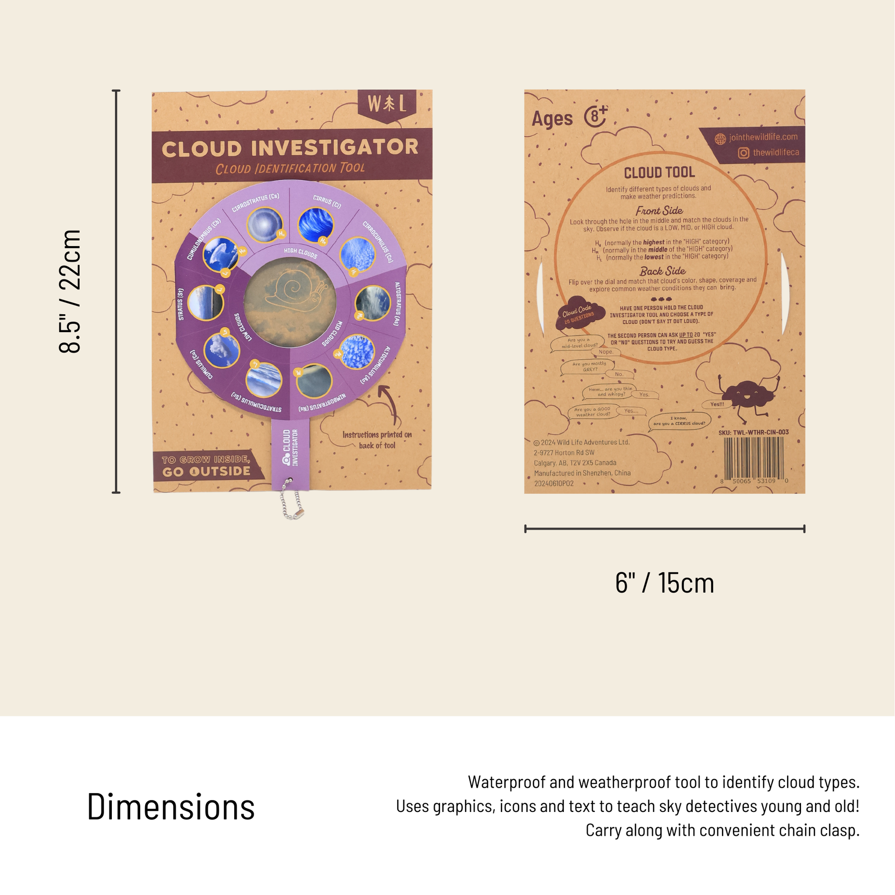 Being able to read the clouds can make all the difference when preparing for an outdoor adventure or making decisions mid-route. The Cloud Investigator is your ultimate skywatching companion, designed to help you quickly and easily identify cloud types while exploring the outdoors. Crafted from durable 24PT laminated material, this tool is weatherproof and built to withstand all your adventures. Its compact design now includes a chain loop, allowing you to attach it to your backpack or carabiner for quick access, making on-the-go forecasting a breeze. Using the Cloud Investigator is simple and fun—hold it at arm’s length, look through the observation hole, and match the clouds in the sky to the images printed on the tool. Whether you’re planning a hike, teaching kids about weather patterns, or just curious about the skies, this tool makes cloud identification engaging and accessible. A perfect way to add an exciting layer of exploration to our outdoor experiences.